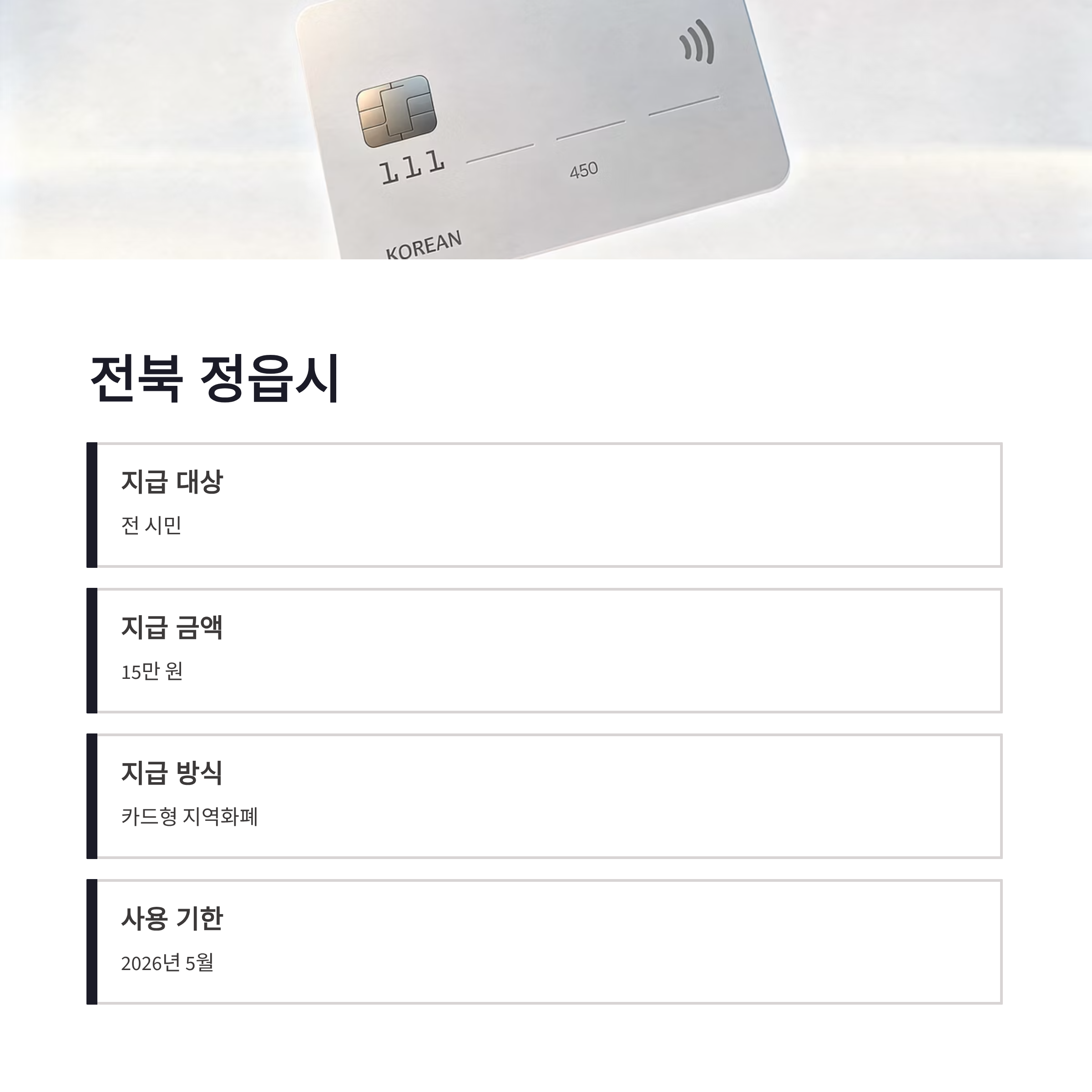 | 전북 정읍시 | 전 시민 | 15만 원 | 카드형 지역화폐 | 2026.5월 |