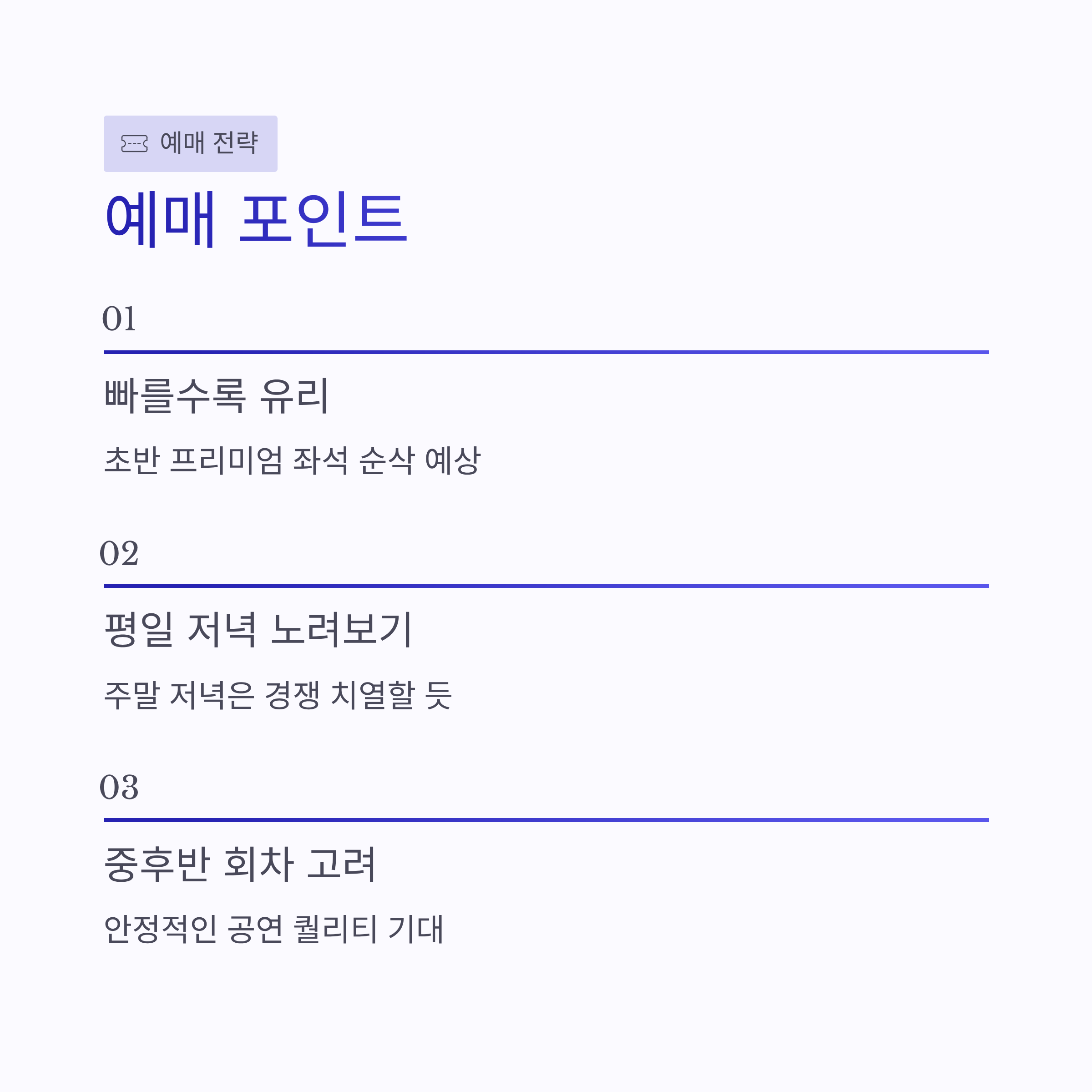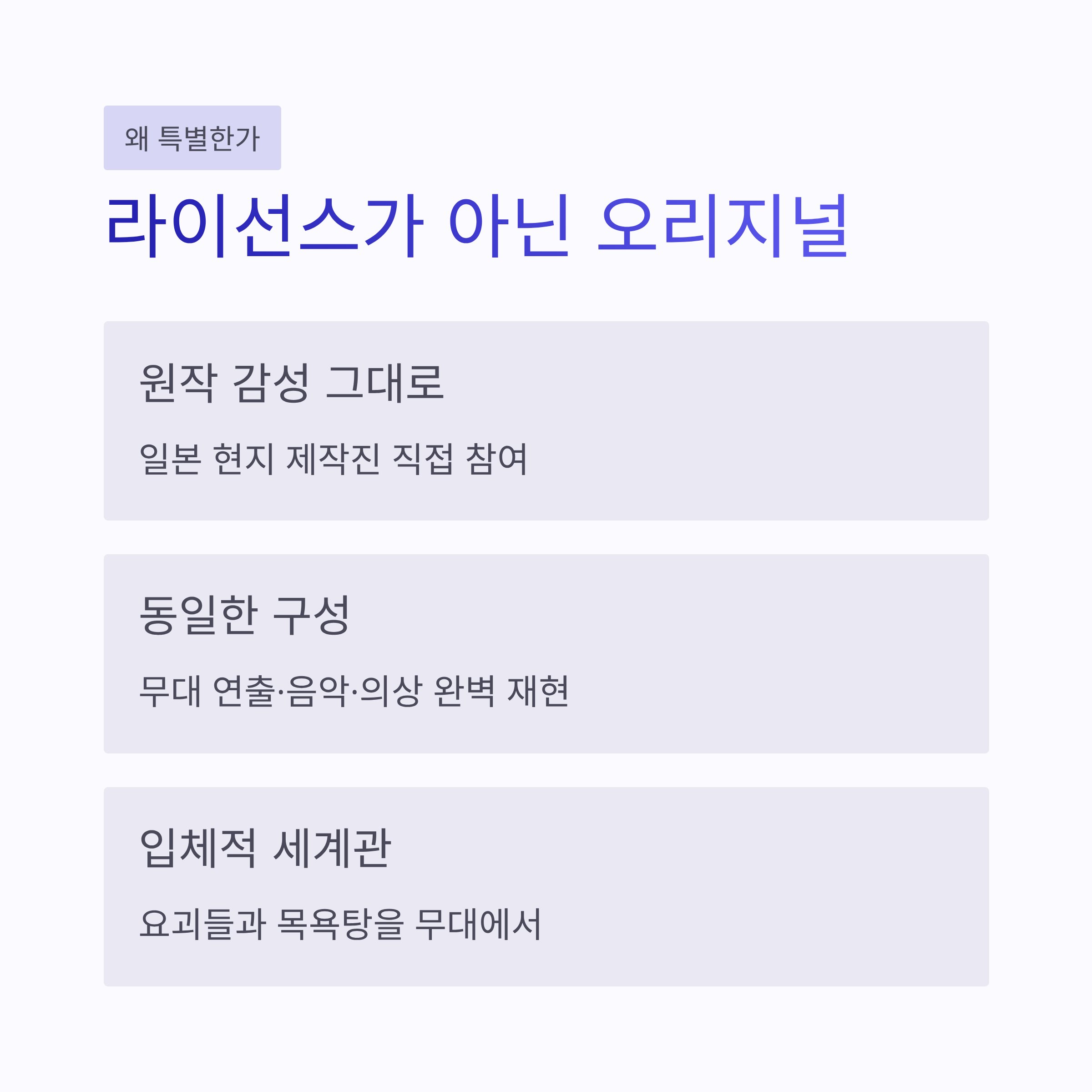 | 관람 포인트 | 일본 현지 연출·무대 그대로 |