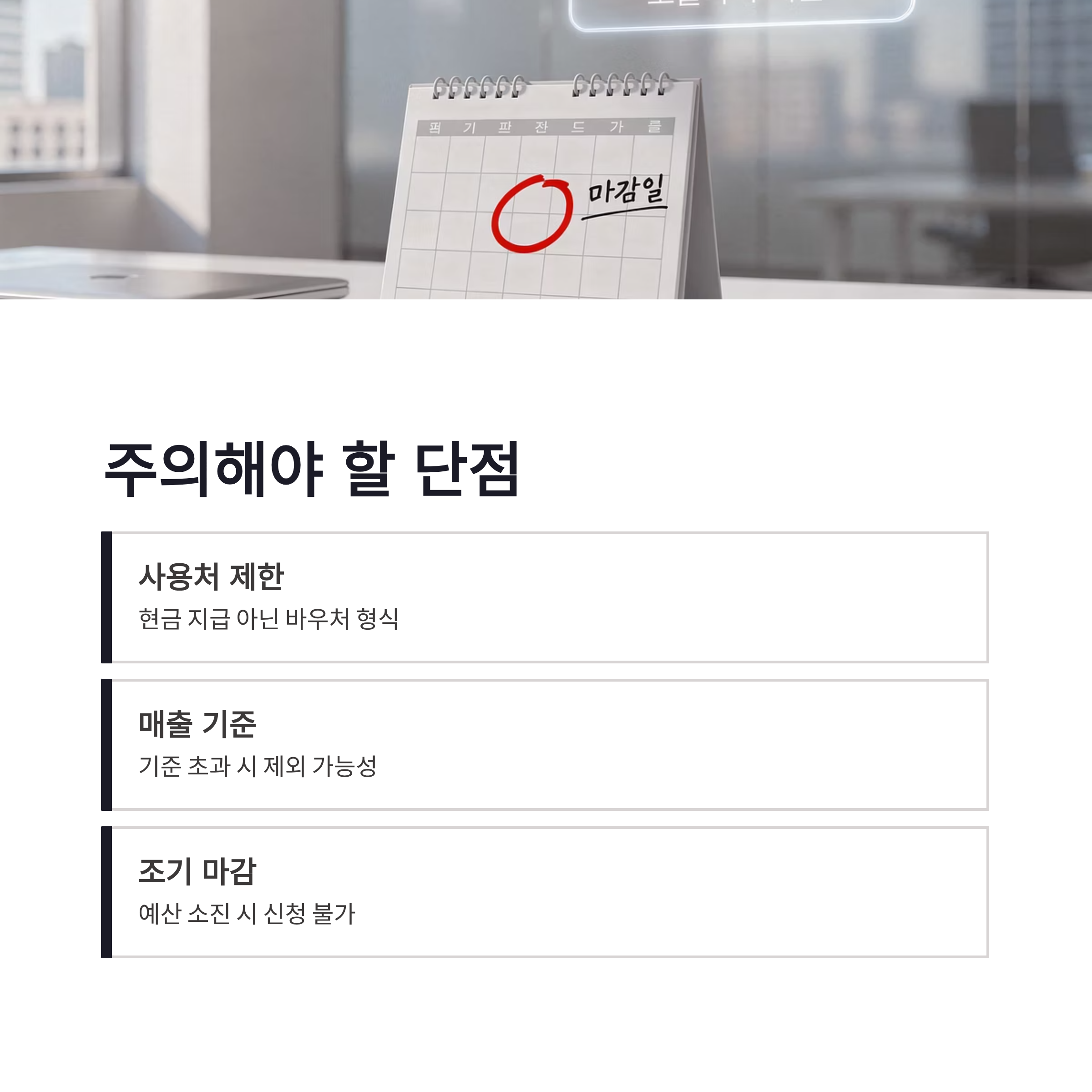 * 현금 지급이 아니라 사용처 제한 * 매출 기준 초과 시 제외 가능성 * 예산 소진 시 조기 마감 가능