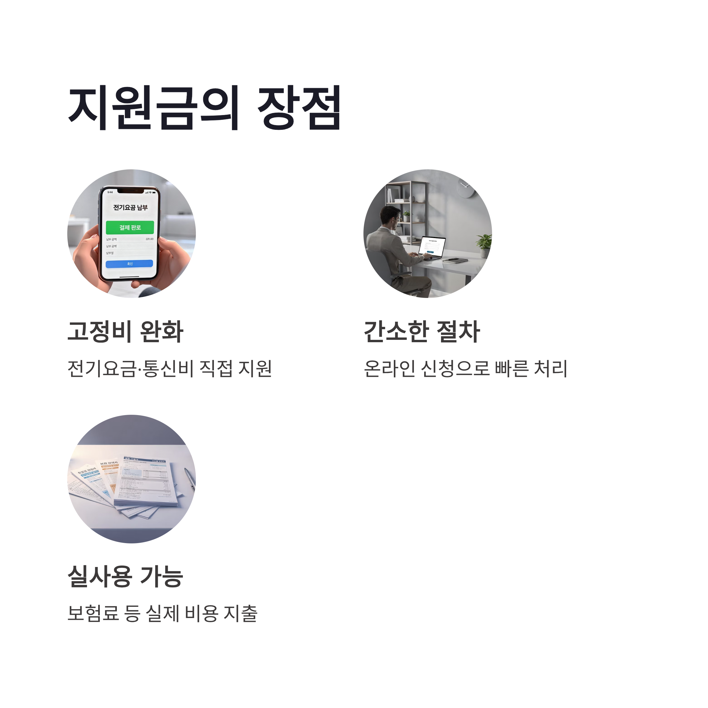 * 고정비 부담 완화에 직접적 도움 * 온라인 신청으로 절차 간소화 * 전기요금·통신비·보험료 등 실사용 가능