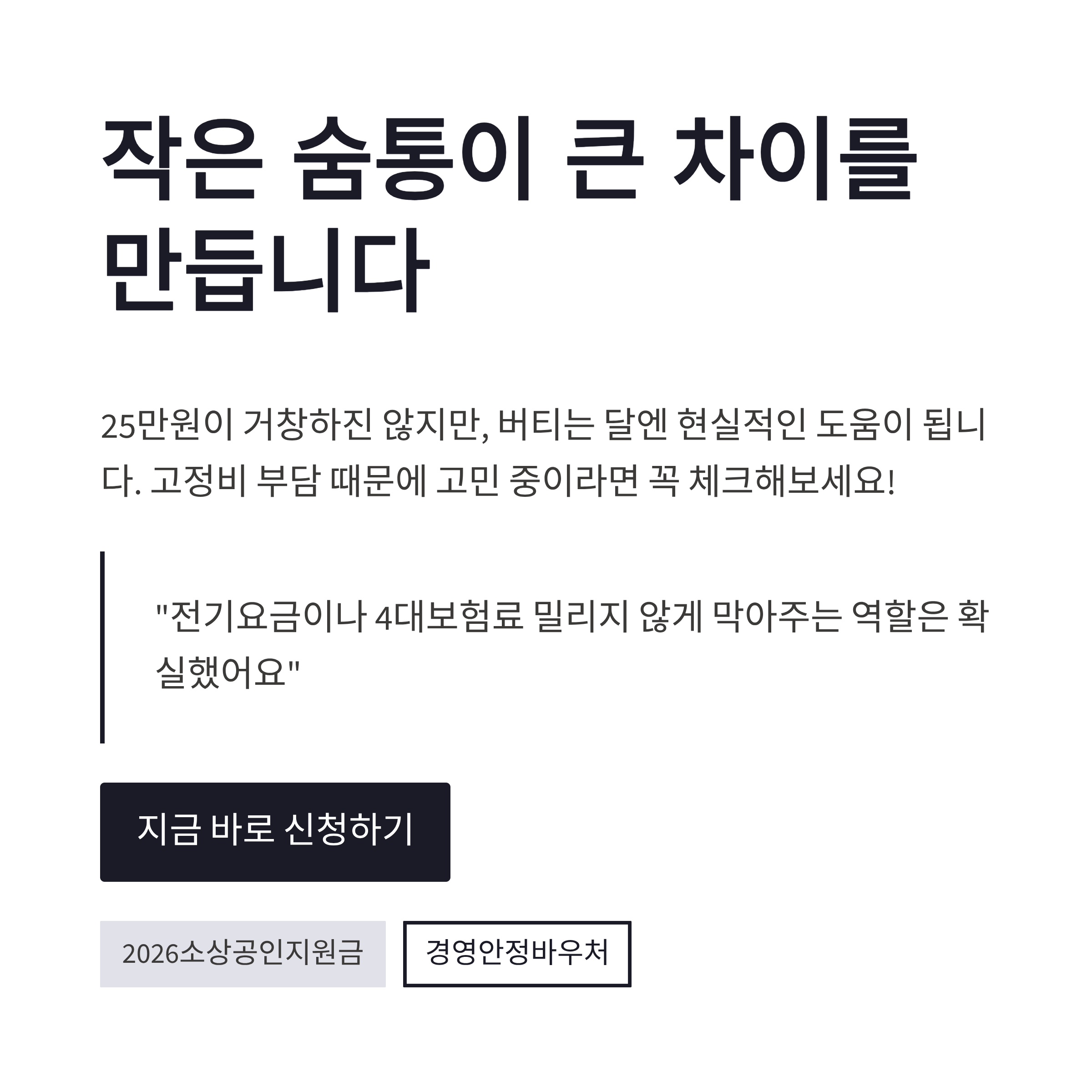 혹시 지금 고정비 부담 때문에 고민 중이신가요? 그렇다면 이번 25만원 경영안정바우처는 한 번쯤 꼭 체크해보셔도 좋겠습니다. 작은 숨통이 의외로 큰 차이를 만들더라구요 ㅎㅎ