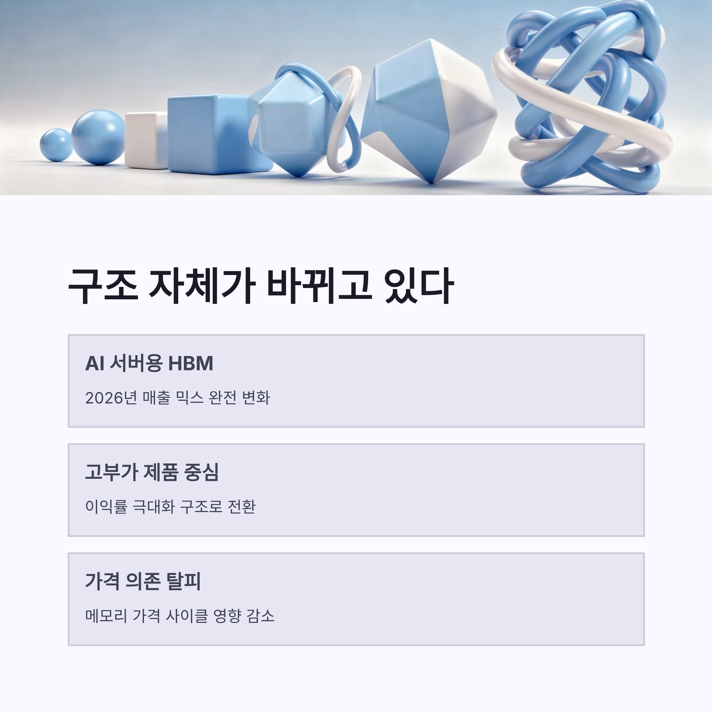| 핵심 동력 | DDR·낸드 | HBM 확대 | AI·HBM 독주 |
