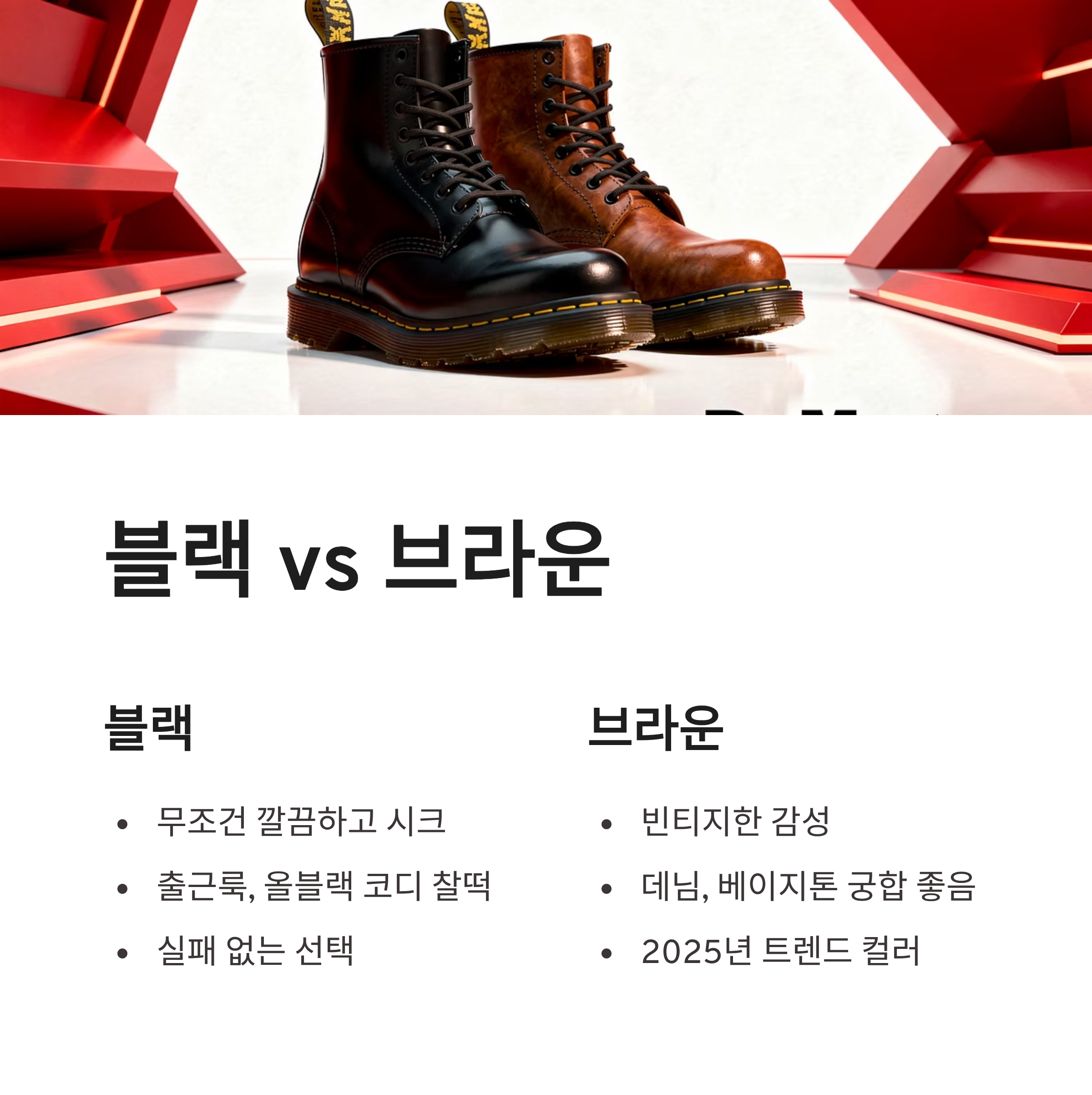 정리하자면 닥터마틴 리더는 디자인, 착용감, 활용도 다 평균 이상입니다. 과하지 않아서 매일 신기 좋고, 코디 스트레스도 적어요. 처음 닥마 도전하는 분들한테도 부담 없고, 이미 워커 있는 분들한테는 서브 신발로 딱이에요. 저는 개인적으로 브라운 쪽에 한 표!ㅎㅎ 여러분은 어떤 컬러가 더 끌리시나요?