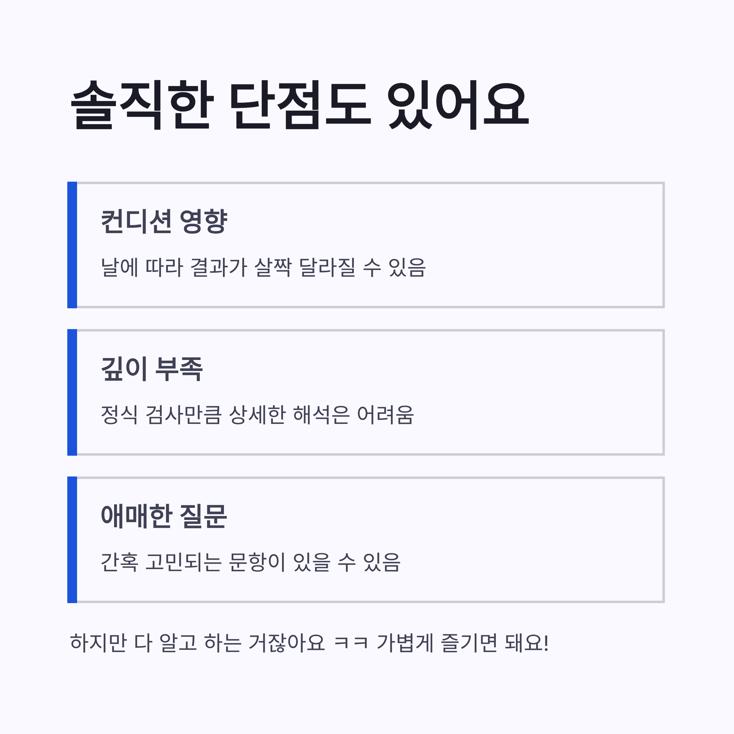 * 날 컨디션 따라 결과 살짝 달라질 수 있음 * 정식 검사만큼 깊은 해석은 부족 * 애매한 질문은 고민되기도 함