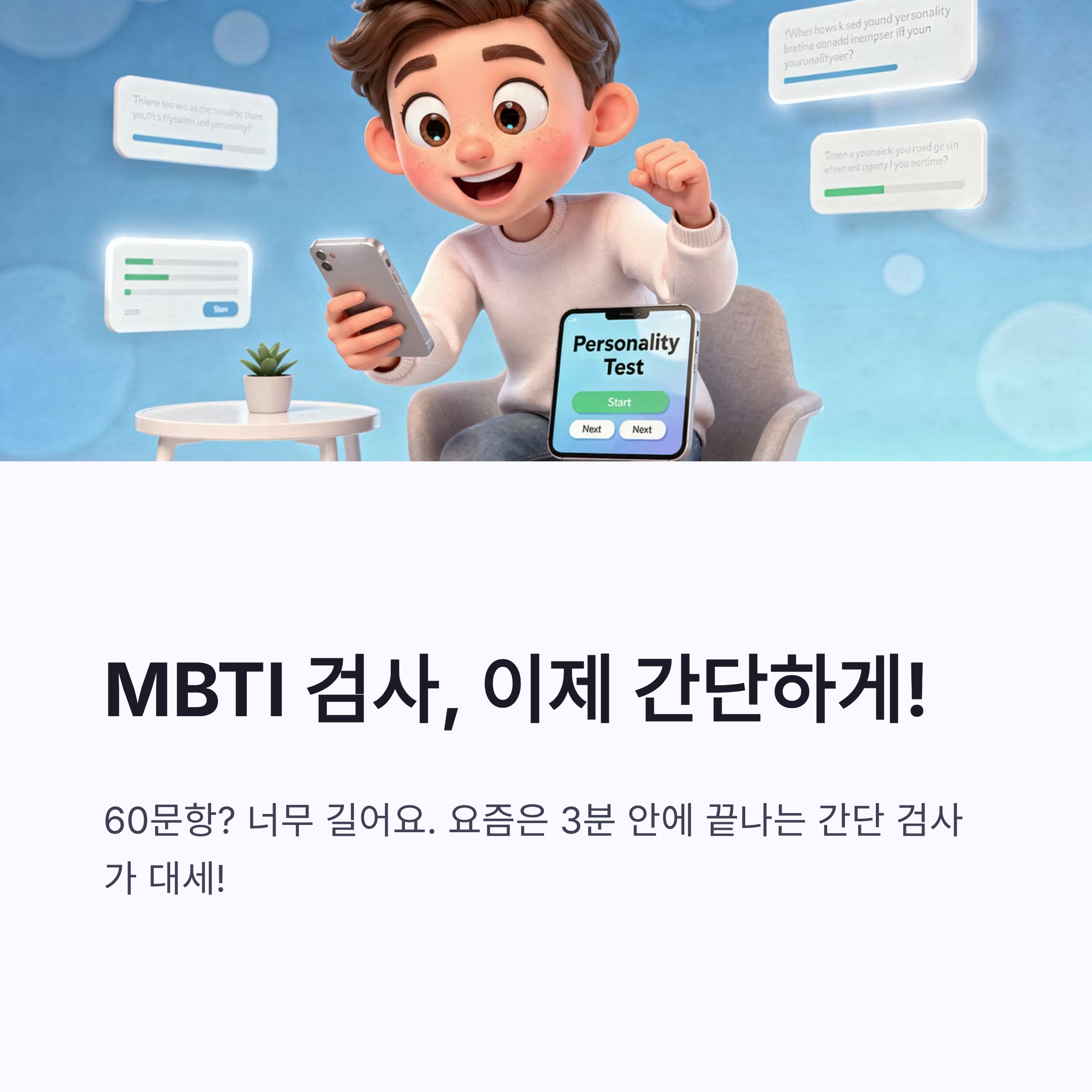 특히 회사나 소개팅, 모임에서 “MBTI 뭐야?”라는 질문은 아이스브레이킹용이라 정확한 임상 검사 수준까진 아무도 기대 안 하거든요. 그래서 요즘은 질문 10~20개 내외로 끝나는 성격테스트 MBTI 간단 검사가 딱 좋은 포지션 같았어요. 개인적으로는 짧은 시간 + 결과 바로 공유 가능 이 조합이 제일 컸습니다. 이건 진짜 편했구요!