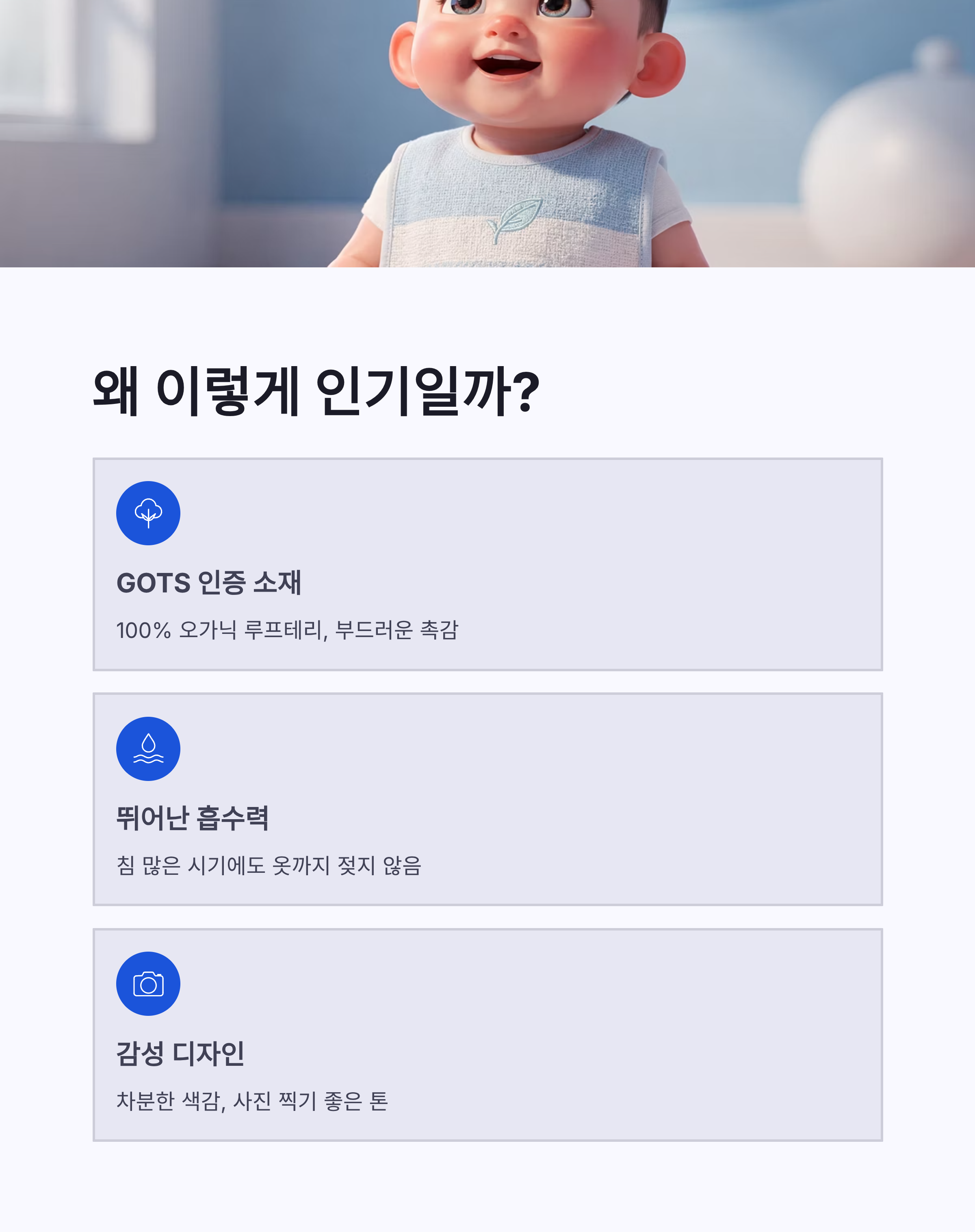 요즘 육아맘 커뮤니티 보면 얼쓰빕 오가닉빕 얘기 안 나오면 대화가 안 되더라구요. 저도 처음엔 “턱받이가 다 거기서 거기 아냐?” 했는데… 직접 써보니 생각이 바뀌었슴다. 얼쓰빕 오가닉빕은 촉감부터가 달라요. GOTS 인증 받은 100% 오가닉 루프테리 소재라 그런지, 아기 턱에 닿는 순간 느낌이 확 부드럽구요. 침 많이 흘리는 시기에도 흡수력이 좋아서 옷까지 젖는 일이 확 줄었어요. 솔직히 말하면 디자인도 한몫 합니다. 차분한 색감, 촌스럽지 않은 톤이라 사진 찍을 때도 예쁘게 나오더라구요. 그래서인지 프리오더 열리면 바로 품절… 이게 바로 빕케팅의 시작이었슴다 ㅎㅎ 얼쓰빕 오가닉빕은 진짜 타이밍 싸움이에요.