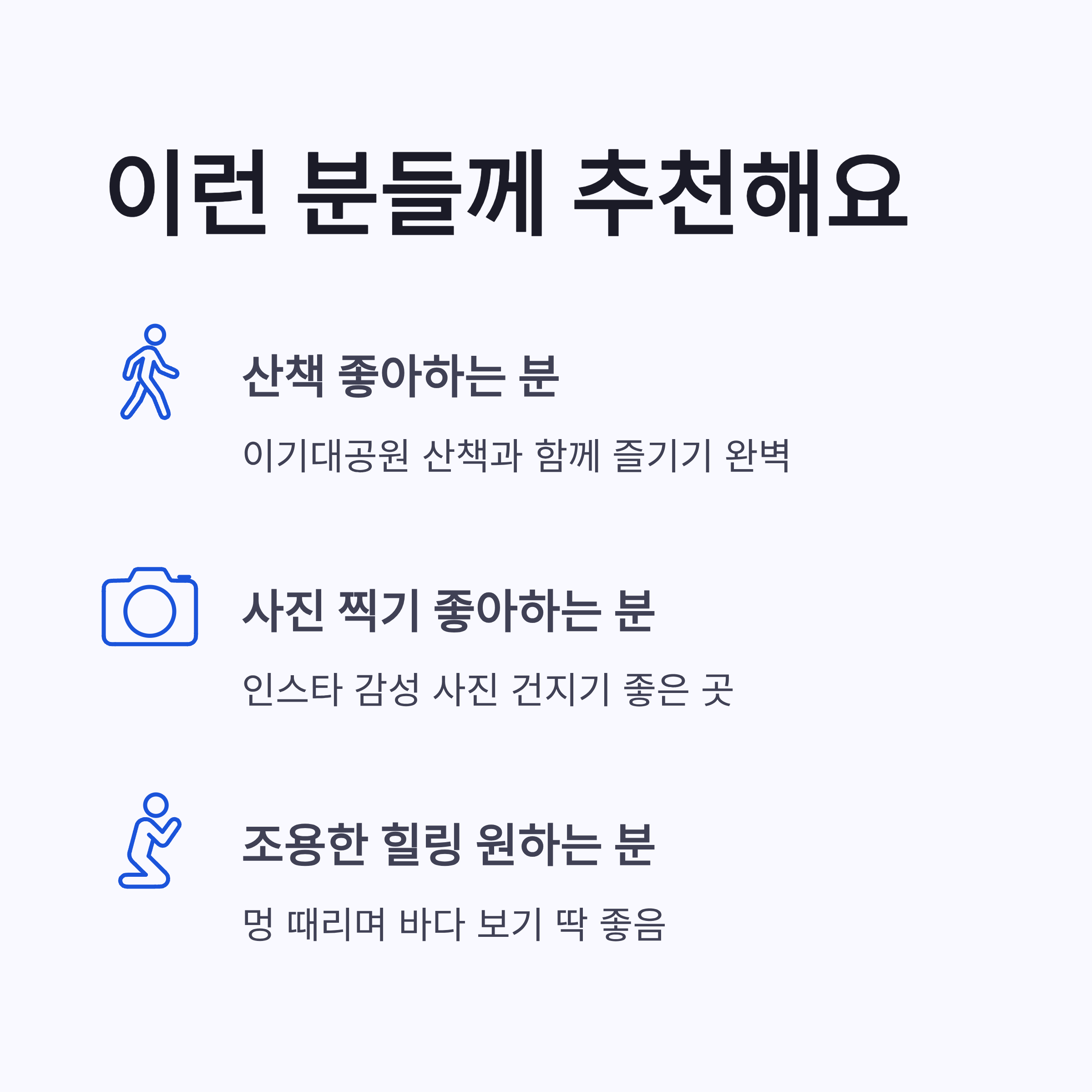 * 바다+절벽 조합이라 뷰가 드라마틱함 * 사람 적어서 조용하고 차분함 * 이기대공원 산책이랑 묶기 좋음